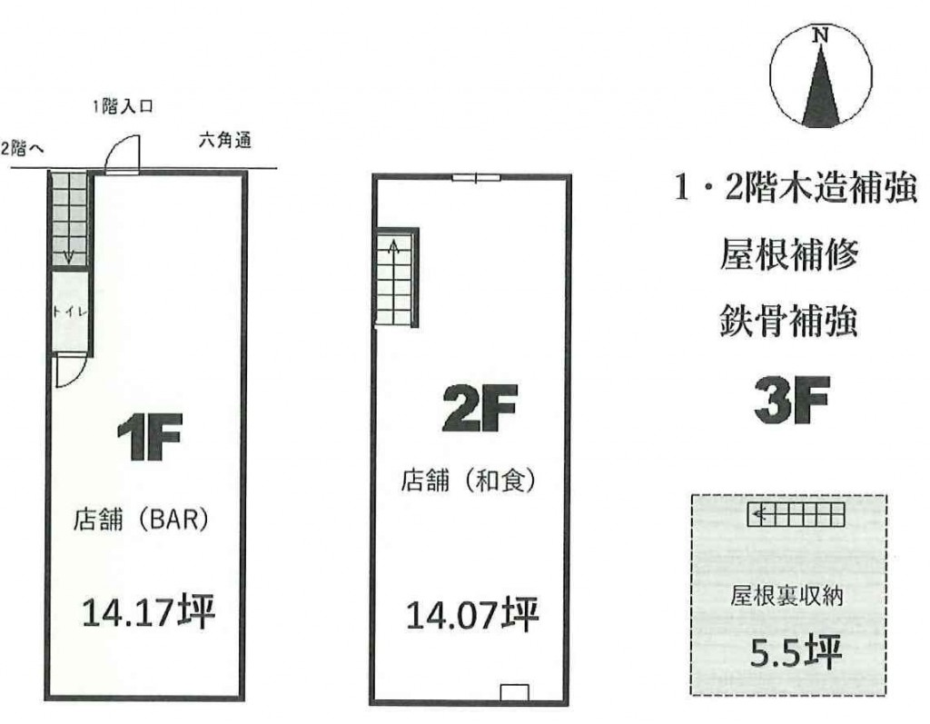 | 備考 | ※本物件は現況有姿(賃貸中)でのお引渡しとなります。 ※売主は本物件について経年による劣化、諸設備等の性能低下等についてはその責を負いません。※1階 バー、2階 和食店へ賃貸中(2024年より開始) ※新規内装にて開業 |